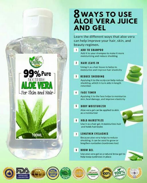 Uses for aloe vera gel. It helps to detox the body. Both consuming it and applying it directly helps with eliminating bacteria. Aloe vera gel acts as a toner to our face as well.